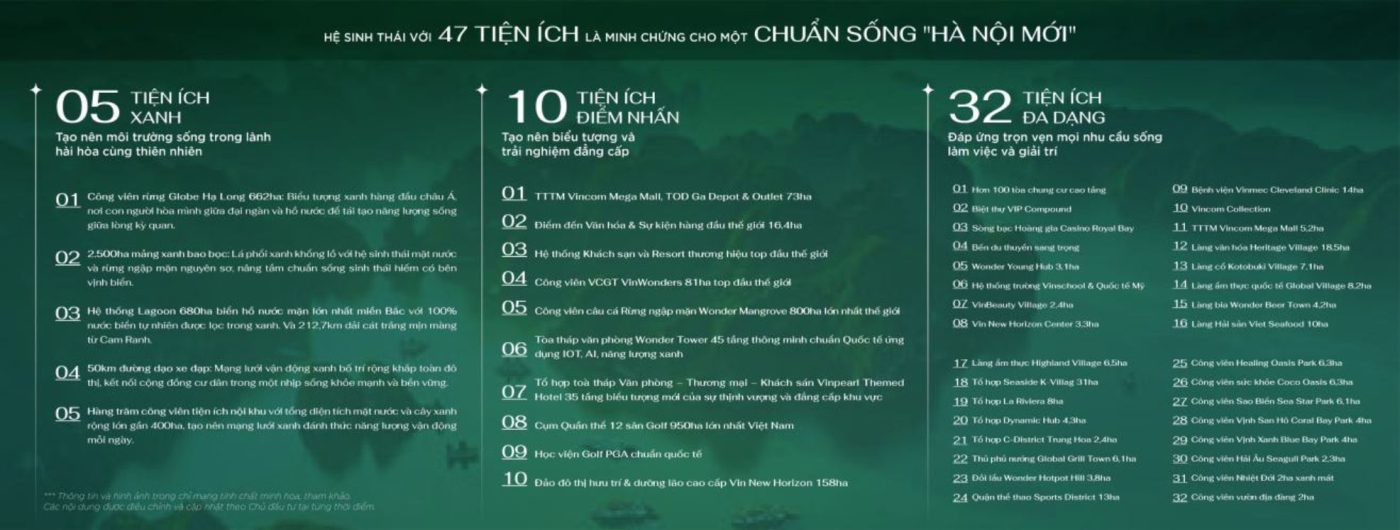 Vinhomes Global Gate Hạ Long được định hướng trở thành đại đô thị cửa ngõ quốc tế – trung tâm giao thương, du lịch và dịch vụ mới của Hạ Long và tỉnh Quảng Ninh, nơi hội tụ đồng thời nghỉ dưỡng – giải trí – văn hóa – thương mại – sinh hoạt đô thị hiện đại. Với lợi thế nằm giữa vịnh biển, sông nước và không gian tự nhiên rộng lớn, hệ tiện ích của dự án cung cấp 47 tiện ích sinh thái và 12 tiện ích biểu tượng phục vụ nhu cầu sinh hoạt thường ngày mà còn kiến tạo phong cách sống nghỉ dưỡng 24/7, đáp ứng cả cư dân lẫn du khách trong nước và quốc tế.